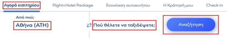 - Ανοίγουμε την ιστοσελίδα της Aegean, στην καρτέλα Αγορά εισιτηρίου, επιλέγουμε την αφετηρία (Από πού;) και τον προορισμό (Που θέλετε να ταξιδέψετε) του ταξιδιού μας, και πατάμε το κουμπί Αναζήτηση.