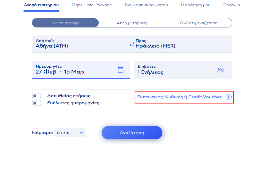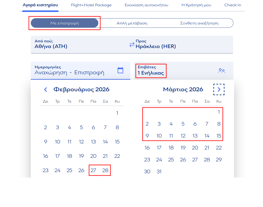 - Στην συνέχεια βεβαιωνόμαστε ότι το εισιτήριο είναι μετ΄ επιστροφής, οι ημερομηνίες που επιλέγουμε βρίσκονται από 27 Φεβρουαρίου 2026 έως και 15 Μαρτίου 2026, και οι επιβάτες είναι Ένας ενήλικας.
