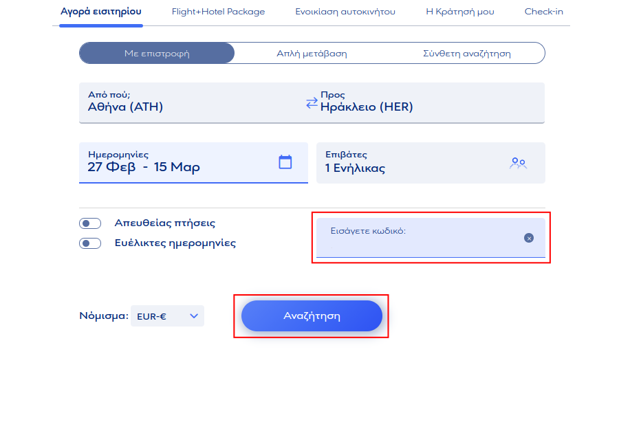 - Τέλος εισάγουμε τον εκπτωτικό κωδικό (προτείνεται αντιγραφή/επικόλληση) και πατάμε το κουμπι Αναζήτηση. Αν δεν υπάρξει κάποιο πρόβλημα η διαδικασία συνεχίζεται στα επόμενα στάδια της κράτησης μας.