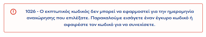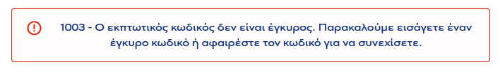 - Σε περίπτωση που ο εκπτωτικός κωδικός έχει εισαχθεί λάθος εμφανίζεται μήνυμα με κωδικό σφάλματος 1003.