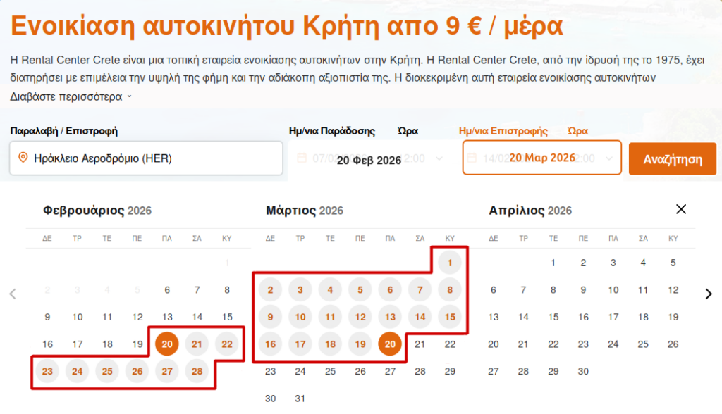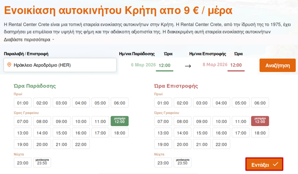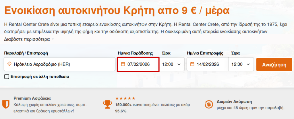 - Ανοίξτε την ιστοσελίδα του Rental Center Crete και κάντε κλικ στην Ημερομηνία Παράδοσης.