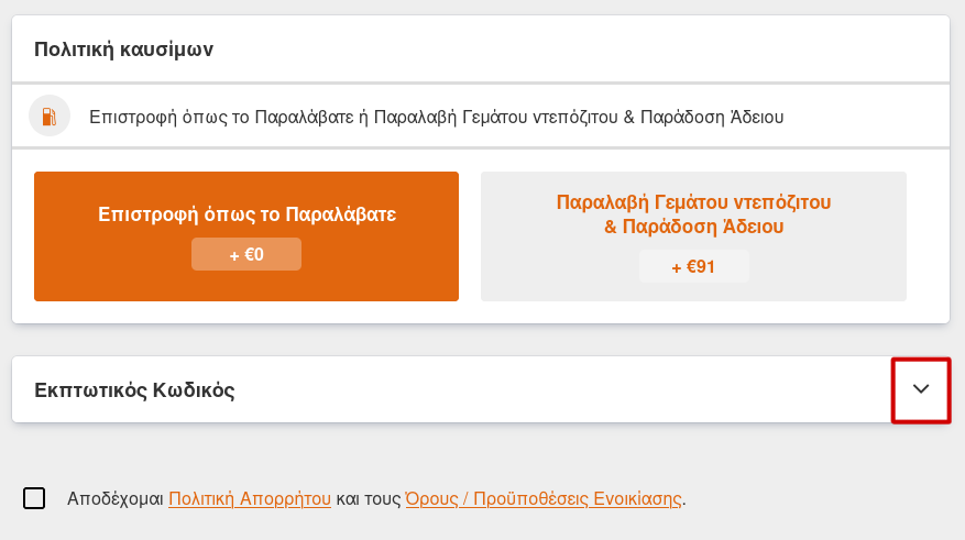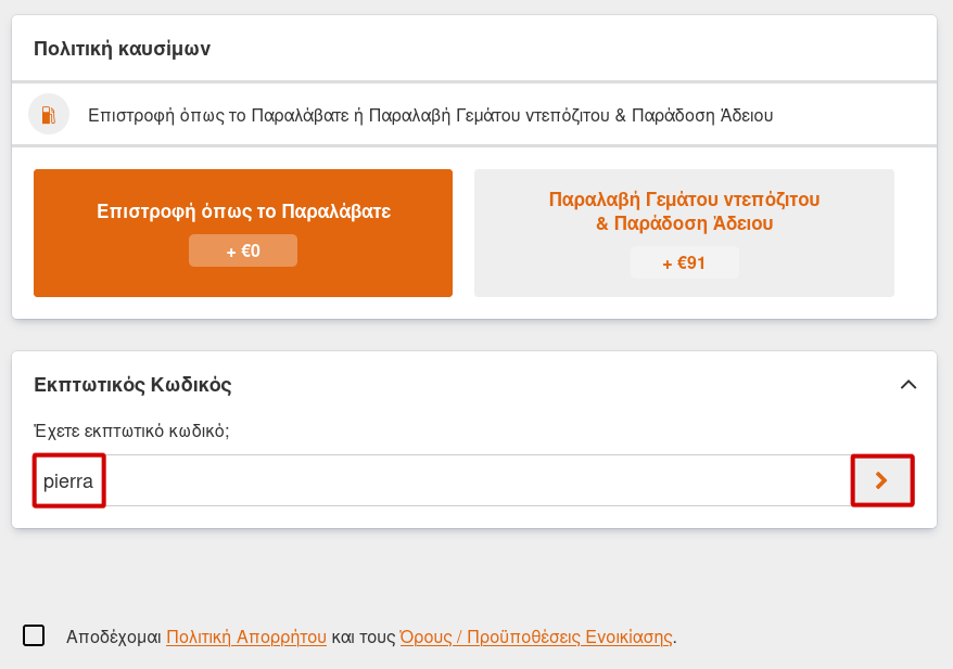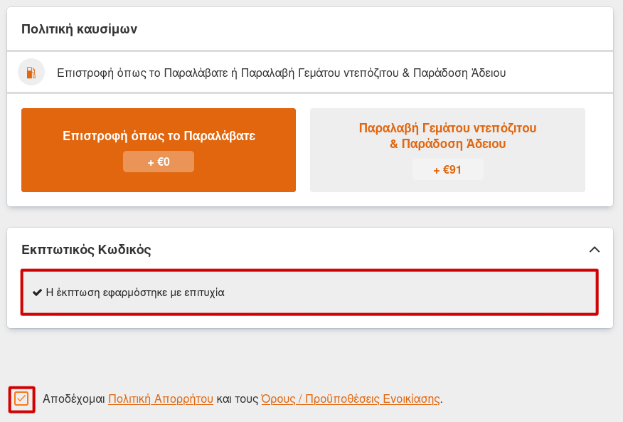 - Βεβαιωθείτε ότι η έκπτωση εφαρμόστηκε με επιτυχία και τσεκάρετε το αντίστοιχο κουτί για να αποδεχθείτε την Πολιτική Απορρήτου και τους Όρους Ενοικίασης.
