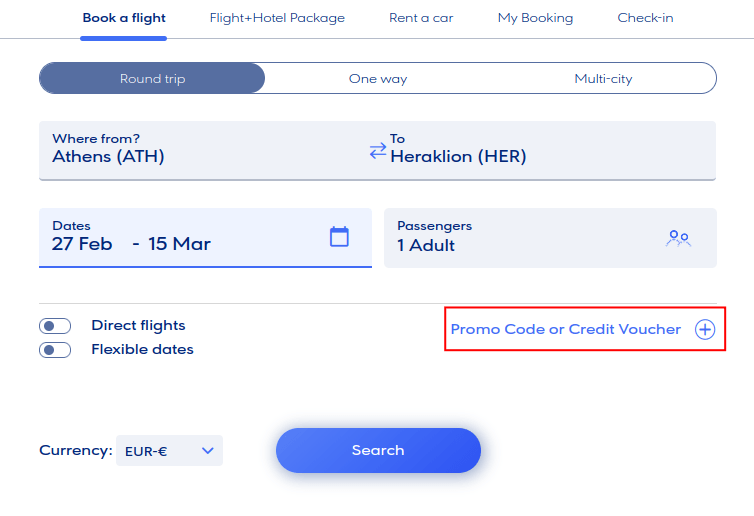 - Open the website of Aegean Airlines, in the Book a flight tab, select the departure point (Where from?) and the destination (Where to?) of your trip, and click the Search button.