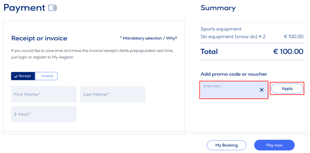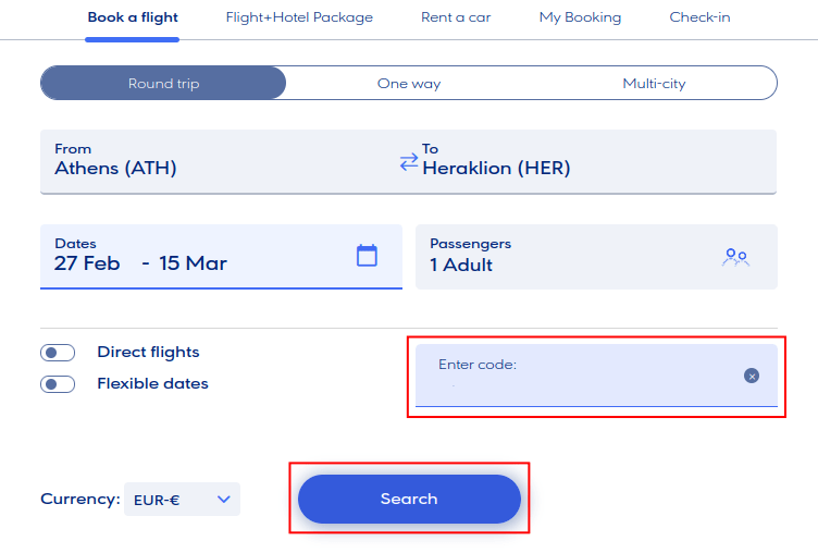 If you have made a reservation for two or more people, the discount code cannot be applied as it is personal. Please send a request to the contact page of Aegean, including your reservation code and the surname under which the reservation was made, so they can provide you with a booking code for each person individually. You can also contact the specific office by phone at +302106261709 from Monday to Friday, between 9:00 AM – 12:00 PM & 2:00 PM – 4:00 PM.