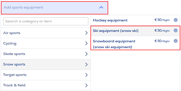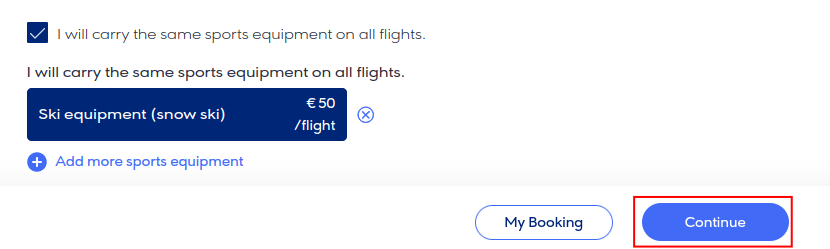 - In our booking, look for and find the section for Sports equipment and click the Add sports equipment button.