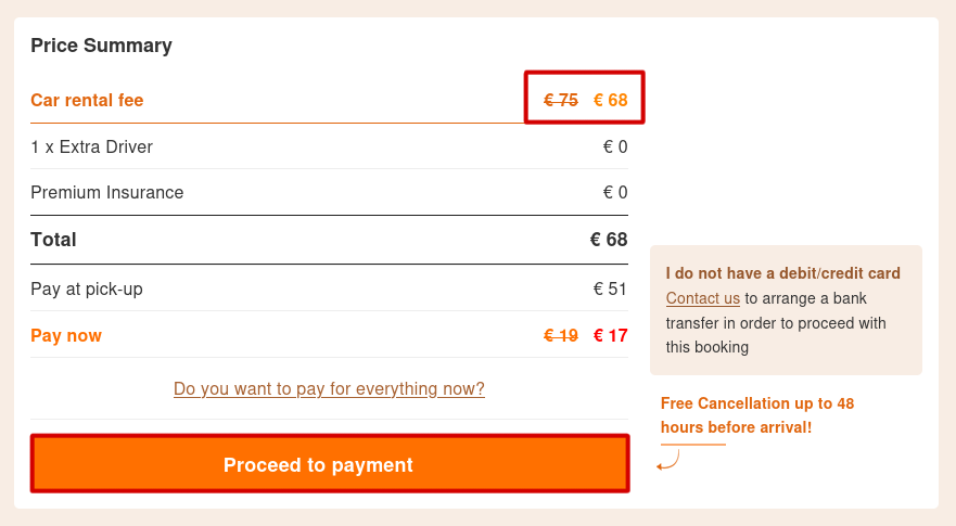 - Scrolling down, check if the discount is applied to the Car Rental Fee click the button Proceed to payment.