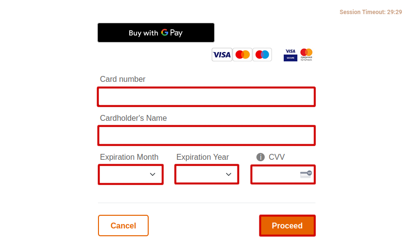 - Finally enter your card details and click Proceed to make the payment.