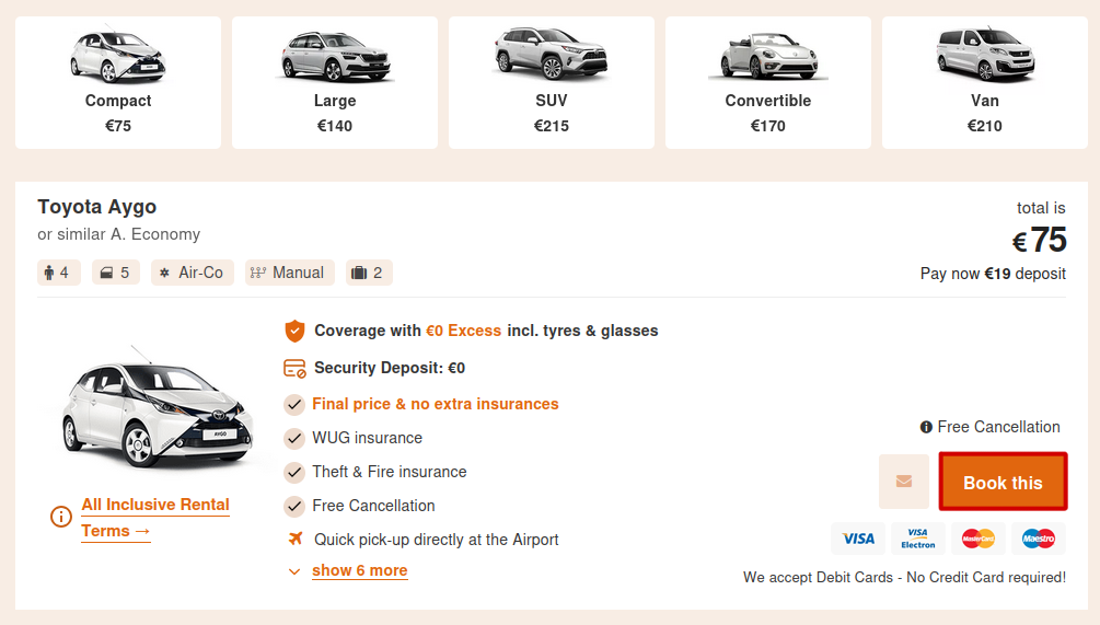 - Select the car you like from the list by clicking the Book this button.