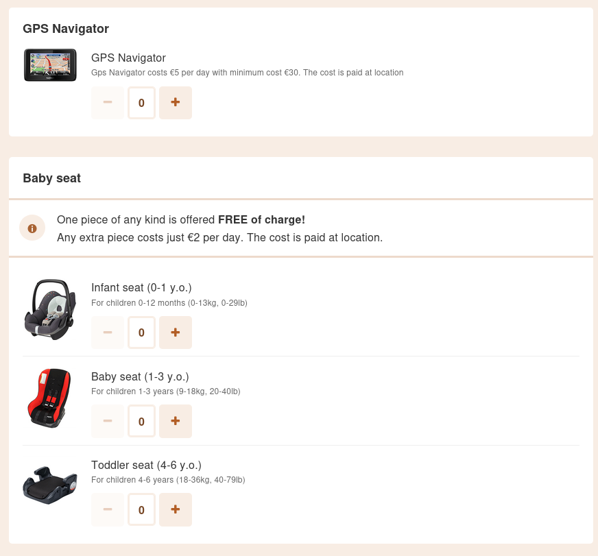 - Check if you want a GPS Navigator or a Baby seat.