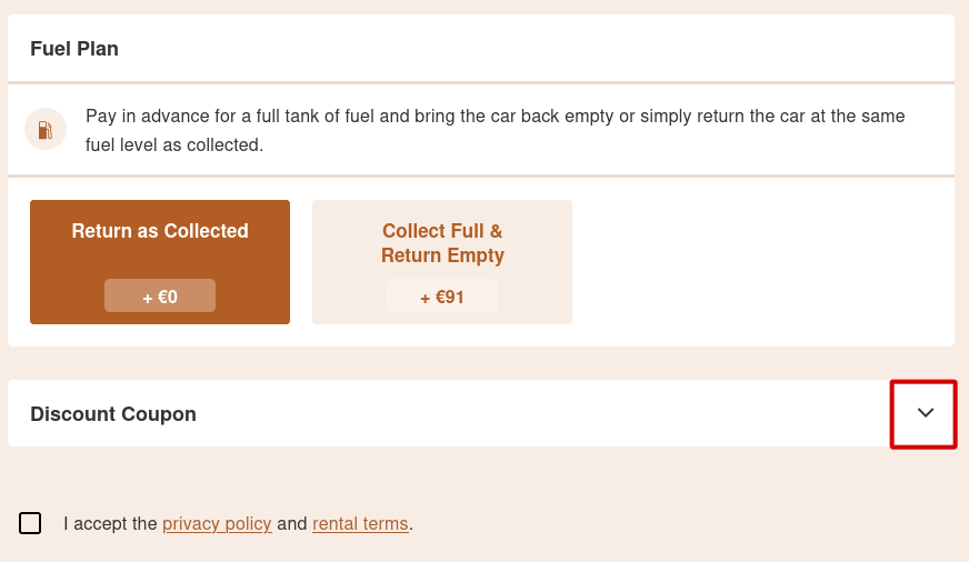 - Make sure that the discount code is successfully applied and check to accept the privacy policy and rental terms.